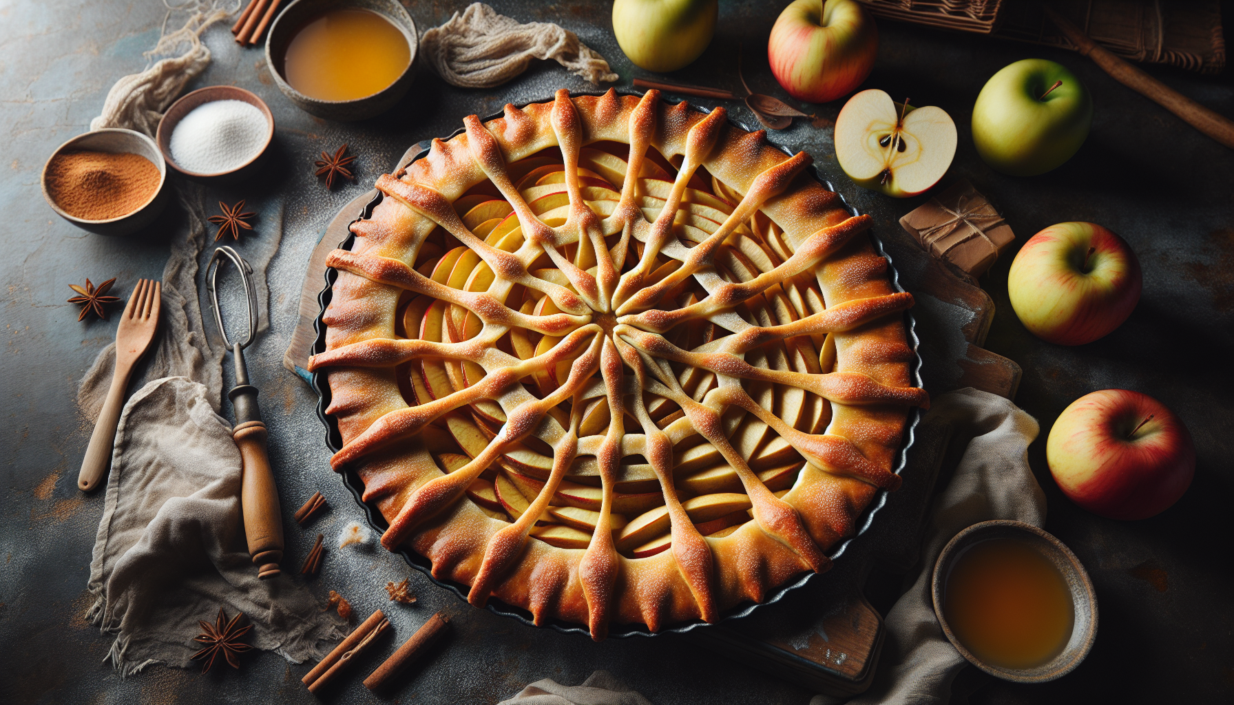 Plăcinta de mere cu crustă în formă de păianjen este un desert delicios și atrăgător, perfect pentru a fi servit în cadrul petrecerilor de Halloween sau oricând dorești să impresionezi oaspeții cu ceva creativ și savuros. Acest desert combina gustul clasic al plăcintei de mere cu un aspect vizual neobișnuit, care cu siguranță va atrage aplauze din partea tuturor celor prezenți.